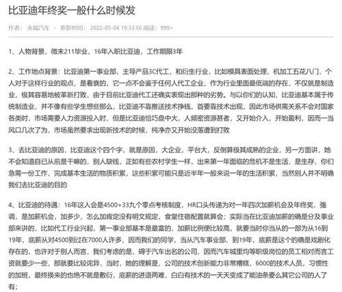 最近朋友圈里可是炸开了锅,大家都在热议比亚迪的年终奖!没错,就是那个在新能源领域风生水起的比亚迪,这次年终奖的爆料可是让人眼睛一亮。下面就让我带你一探究竟,看看比亚迪这次年终奖的“秘密”。